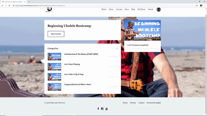 If you’re a complete beginner, we recommend getting started with the Beginning Ukulele Bootcamp. This section features 25 lessons including an introduction to different types of ukuleles, ukulele parts, how to hold your ukulele, how to strum, and a whole lot more. When you’re ready, you can move on to another series of lessons that interests you and keep on building skills from there.